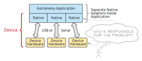 When something doesn't work, the first thing to do is localize the problem. The top diagram on the right shows how things were before ASCOM. The "device" includes both the actual device as well as special "native" adapter code inside the app. As a user how do you know who's responsible? It could be the app developer (their special native adapter code), or the USB connection, or the device itself (including its firmware)? Often this leads to "finger pointing" and frustration.