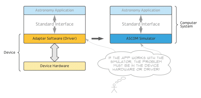 Have a look at the diagram below. By separating the device specific "native" logic from the app, ASCOM makes it much easier to isolate the problem. The app has no "native" special logic in it. Since the app uses identical calls for all devices, you can tell the app to use the ASCOM Simulator for the device instead of your real device. The app doesn't see any difference. Now try to reproduce your problem. Is it gone? If so, then you know the problem is in the device adapter/driver, the USB, or the physical device. The problem is not with the app (*). This is a game changer. No more finger pointing.