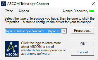 The chooser returns the selected device's ProgID (including a freshly created ProgID for an Alpaca dynamic Driver). You can pass a (saved) ProgID to the Choose() method, and that device will be pre-selected in the list. The drivers are listed in a special registry area, with the user-friendly name and progID. The Chooser hides all of this from you, and allows us to evolve the registry area without fear of breaking your code. Also, the Chooser provides an interlock which forces the user to pop open the configuration dialog for the chosen device before being able to click OK to change the selected device. It looks like this to the user: